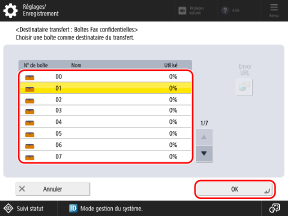 Sélectionnez la boîte de réception des fax confidentiels à utiliser comme destinataire des transferts ou emplacement mémoire, puis appuyez sur [OK].