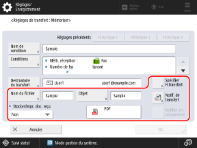 Configurez les réglages permettant d'envoyer les résultats du transfert ou de la mémorisation par e-mail lorsque le transfert ou la mémorisation est terminé.