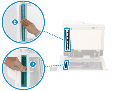 Essuyez les rouleaux à l’intérieur du chargeur et la zone de numérisation du chargeur de documents pour éliminer la poudre de graphite et la poussière qui y adhèrent.