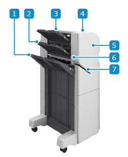 Pour la procédure d'utilisation du dispositif de retenue du papier, consultez la description des pièces extérieures du module de finition. Vue extérieure