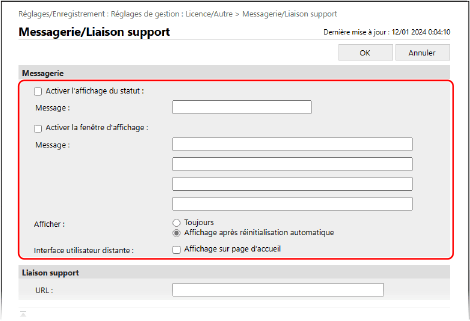 Si vous souhaitez également afficher l’avis dans [Messagerie] sur la page du portail de l’interface utilisateur distante, cochez la case [Affichage sur page d'accueil] pour [Interface utilisateur distante].