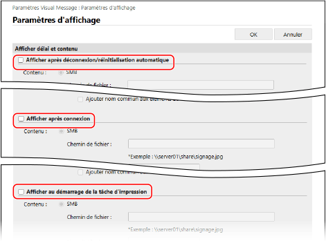 [Réglages affichage écran de connexion][Afficher au démarrage de la tâche d'impression]