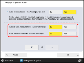 Configurez ce paramètre sur [Oui] pour afficher la ligne du temps commune aux utilisateurs non authentifiés lorsque les utilisateurs ne sont pas connectés à la machine ou sont des utilisateurs invités.