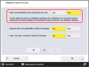 Configurez ce paramètre sur [Oui] pour permettre aux utilisateurs autres que les administrateurs d’ajouter des boutons partagés et de modifier les paramètres [Personnaliser pour util. com.].