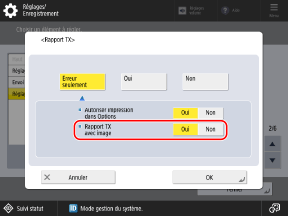 Pour imprimer un rapport uniquement en cas d’erreur, sélectionnez [Erreur seulement]. Dans ce cas, réglez [Autoriser impression dans Options] sur [Oui] si vous souhaitez pouvoir choisir d’imprimer le rapport à partir de l’écran de numérisation ou de télécopie.