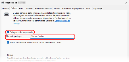 Configurez les réglages de partage de l'imprimante sur l'ordinateur qui servira de serveur d'impression afin que les autres ordinateurs du réseau puissent utiliser le serveur d'impression.