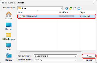 Ouvrez le dossier du pilote à ajouter, sélectionnez le ficher INF dans le dossier [Driver], puis cliquez sur [Ouvrir].