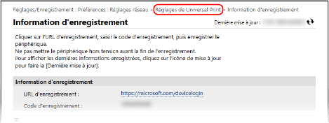 [Préférences] dans l'écran [Accueil] ou un autre écran pour effectuer l'enregistrement. Le panneau de commande ne peut être utilisé que pour configurer le réglage Utiliser Universal Print et vérifier l'état d'enregistrement.