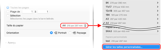 Pour [Taille du papier], sélectionnez [Gérer les tailles personnalisées].