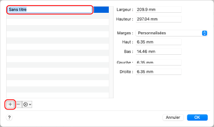 Cliquez sur [+] en bas à gauche, cliquez sur [Sans titre], puis saisissez le nom du papier de format personnalisé.