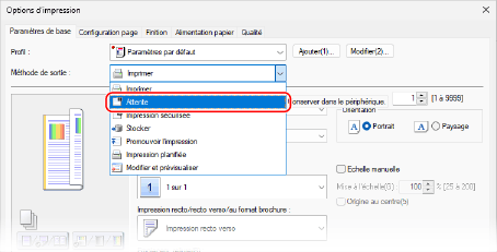 Vous pouvez configurer la fonction de mise en attente dans les réglages d'impression du pilote et envoyer à la machine un document à mettre en attente.