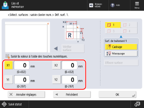 3, appuyez sur [Saisie au clavier num.], et spécifiez le cadre en saisissant avec les touches numériques les valeurs de [X1] à [Y2], le coin supérieur droit de l'original étant le point de référence.