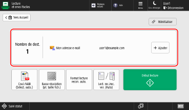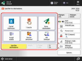 Avec Lecture et envoi faciles/Lecture facile, vous pouvez configurer les fonctions de base, telles que spécifier des destinataires et régler les couleurs, en utilisant simplement des boutons.