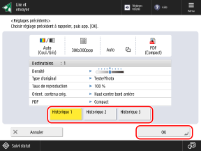 Masquer les destinataires (gestion des numéros d’accès)Dans l'écran [Réglages précédents], sélectionnez l'historique à rappeler, puis appuyez sur [OK].