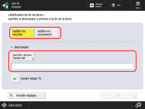 Configurez les réglages permettant d'envoyer le résultat de la transmission par e-mail lorsque l'envoi est terminé.