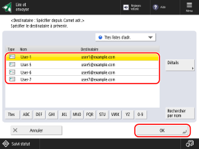 Dans l'écran du carnet d'adresses, sélectionnez le destinataire (adresse e-mail) à spécifier en tant que destinataire de la notification, puis appuyez sur [OK]
