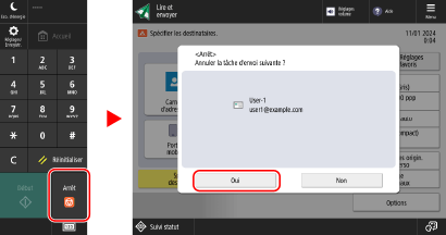 Arrêt] alors qu'il y a plusieurs tâches d'envoi Pour annuler une autre tâche, appuyez sur [Vérifier autres tâches], sélectionnez la tâche à annuler dans la liste des tâches d'envoi, puis appuyez sur [Annuler].