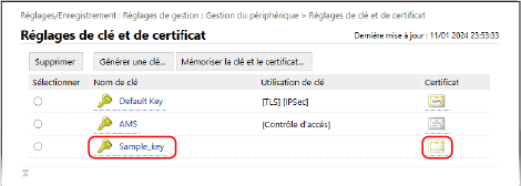 L'écran [Réglages de clé et de certificat] s'affiche.