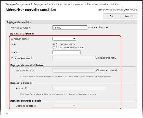 Enregistrez les conditions d’impression des documents sans les conserver ou d’annulation de l’impression, en fonction du nom d’utilisateur et de l’adresse IP. Si vous enregistrez plusieurs conditions, Configurez l’ordre de priorité.