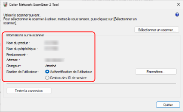 Si la machine n’est pas affichée dans [Informations sur le scanner], cliquez sur [Sélectionner un scanner] et sélectionnez la machine.