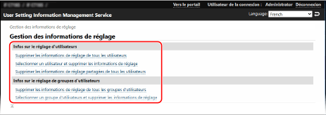 Sur la page Portail de l'interface utilisateur distante, cliquez sur [Gestion des informations de réglage utilisateur].