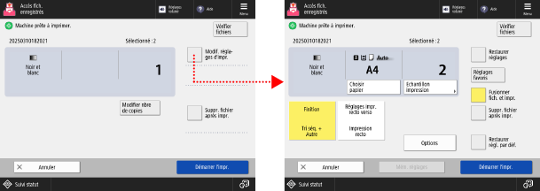 Appuyez sur [Modif. réglages d'impr.] en haut à droite de l'écran pour configurer les réglages suivants :