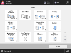 Appuyez sur les boutons dans l'écran pour configurer les réglages d'impression détaillés. Une fois les réglages d'impression configurés, appuyez sur [Fermer] pour revenir à l'écran des réglages d'impression.