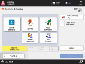 Appuyez sur [Carnet d'adresses], [1 touche] ou [Nouv. destinataire], et indiquez le destinataire depuis le carnet d'adresses ou en le saisissant directement.