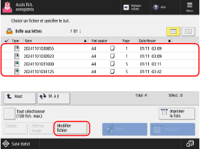 Vous pouvez utiliser le panneau de commande de la machine ou l'interface utilisateur distante pour gérer et modifier les fichiers enregistrés dans une boîte aux lettres comme suit :