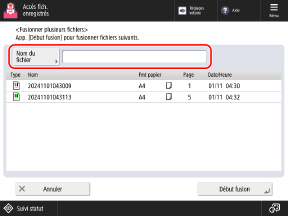 Sur le panneau de commande, appuyez sur [Accès aux fichiers enregistrés] dans l'écran [Accueil]. Écran [Accueil]