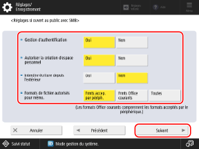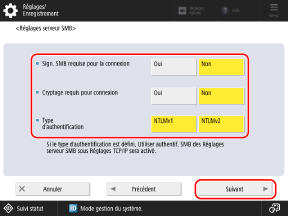 * Lorsque ce réglage est réglé sur [Oui], il n'est pas possible de se connecter à l'Espace avancé depuis un système d'exploitation ne prenant pas en charge la communication cryptée SMB v3.0.