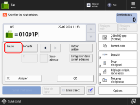 Connectez-vous à l’interface utilisateur distante cliquez sur [Réglages/Enregistrement] [Envoi] [Réglages TX - Réglages fax] dans [Régler durée de pause], saisissez le temps de pause cliquez sur [OK] |