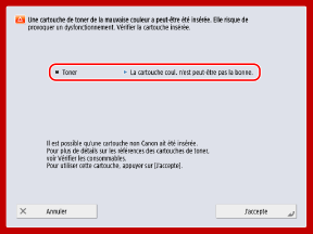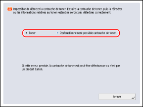 Impossible de détecter la cartouche de toner. Extraire la cartouche de toner, puis la réinsérer ou les informations relatives au toner restant ne seront pas détectées correctement.