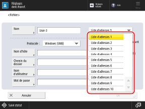 Cette section explique comment enregistrer des destinataires dans une liste d’adresses commune (listes d’adresses 1 à 10) à l’aide du panneau de commande.