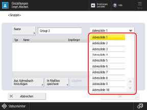Über das Bedienfeld können Sie mehrere Empfänger in derselben Adressliste gruppieren und sie im Adressbuch oder auf Zielwahltasten speichern.