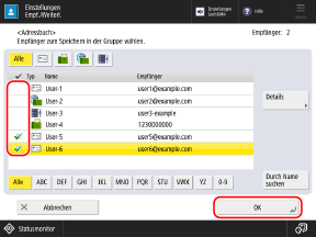Aktivieren Sie die Kontrollkästchen der in der Gruppe zu speichernden Empfänger, und drücken Sie [OK].