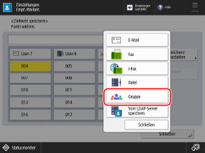 Bildschirm [Startseite]Auf dem Scan- (Scannen und Senden) oder Fax-Bildschirm können Sie auf [Adressbuch] drücken, um eine Gruppe aus dem Adressbuchbildschirm zu speichern.
