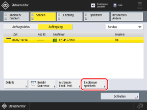 Wählen Sie den Empfänger, der im Adressbuch gespeichert werden soll, und drücken Sie [Empfänger speichern].