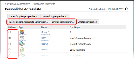 Wählen Sie den zu verschiebenden oder zu kopierenden Empfänger aus, und klicken Sie auf [In eine andere Adressliste verschieben] oder [Empfänger kopieren].