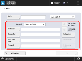 Wenn Sie einen Empfänger eines gemeinsamen Ordners, Dateiservers oder einer Erweiterter Platz im Adressbuch oder unter einer Zielwahltaste speichern, konfigurieren Sie die nachfolgend beschriebenen Punkte.