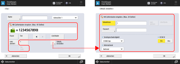 * Das Gerät unterstützt die Verwendung von ITU-T-Standardsubadressen (Internationale Fernmeldeunion - Sektor für Telekommunikationsnormung). Wenn das Zielgerät die Subadressenkommunikation (vertrauliche Kommunikation) unterstützt, können Sie die Vertraulichkeit der gesendeten Dokumente erhöhen, indem Sie eine Subadresse und ein Passwort für den Versand festlegen.