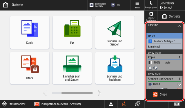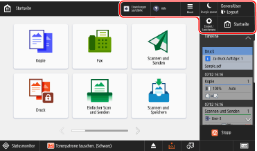 ![]() | [Statusmonitor] Sie können [Auftragsstatus/Protokoll] wählen, um den Verarbeitungsstatus und den Verlauf jeder Funktion sowie die verbleibende Menge an Verbrauchsmaterialien und Teilen zu prüfen. Sie können [Betriebszustand] wählen, um den Status des Geräts und der Vorgänge, die Ursachen von Problemen und Methoden zur Fehlerbehebung zu prüfen. |
