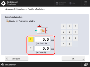 Sie können Formate registrieren, wenn Sie häufig ein bestimmtes, nicht standardisiertes Papierformat verwenden. Sie können das Format auf dem Bildschirm für die Eingabe des Formats aufrufen, so dass Sie das Format nicht jedes Mal neu eingeben müssen.