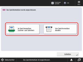 [Bei Anschluss an Speichermedium Option wählen]Sie können auf diesem Bildschirm den Vorgang auswählen, um schnell zu scannen oder zu drucken.