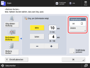 Wenn Sie auf ein Papierformat kopieren, das größer ist als das des Originals, oder wenn Sie Seiten aus einem dicken Buch kopieren, können dunkle Ränder oder Schatten an den Rändern des Originals erscheinen. Sie können die Einstellungen so konfigurieren, dass diese Ränder oder Schatten beim Kopieren gelöscht werden. Sie können auch Lochungen auf dem Original löschen.