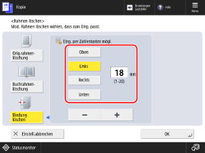 * Wenn [Bindung löschen] eingestellt ist, werden die drei Ränder außer dem Rand mit den Lochungen immer mit einem 4-mm (1/18") Rahmen gelöscht.