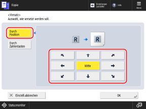 Drücken Sie [Durch Position], und drücken Sie eine Pfeiltaste oder [Mitte], um die Richtung für das Verschieben des Originals zu definieren.
