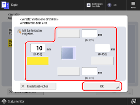 Sie können die Position des gesamten Originals an einen Rand oder in die Mitte des Papiers verschieben oder den Verschiebeabstand in Millimetern angeben.