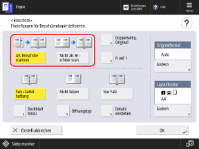 Normalerweise wählen Sie [Als Broschüre scannen]. Wenn Sie ein Original verwenden, dessen Seiten bereits im Broschürenlayout angeordnet sind, wählen Sie [Nicht als Broschüre scan.].