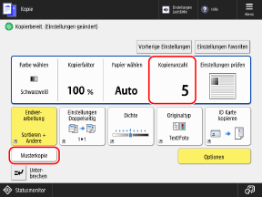 Platzieren von OriginalenGeben Sie auf dem Kopierbildschirm die Anzahl der Kopien ein, und drücken Sie [Musterkopie].
